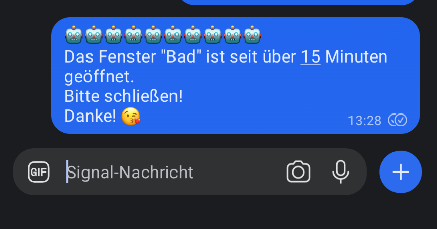 🤖 Das Fenster "{{ trigger.to_state.name | replace('Sensor Fenster ', '') }}" ist seit über 15 Minuten geöffnet. Bitte schließen! 😘
